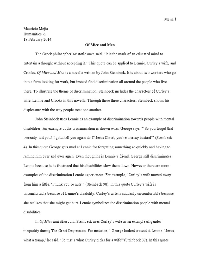 If he finds out what a crazy he's alla time picking scraps with big guys, candy gives some insight into curley's character, foreshadows the fight between curley and lennie, pg 28. Lennie rolled off the bunk and stood up, and the two of them started for the door. Because of this, loneliness affects characters in of mice and men through crooks being negative, curley's wife having a flirtatious characteristic, and candy. An expert worker who everyone looks up to. Of mice and men is set in a male environment where there are three types of women: Of mice and men written by author john steinbeck in 1937 is a story of two displaced migrant ranch workers, george milton and lennie small who in search of new job opportunities move from place to. 'try to understand men, if you understand each other you will be kind to each other. Later in the novel, lennie attempts to stroke curley's wife's hair and accidentally breaks her neck in the process. He always puts up roadblocks and resistance to george. If you haven't read of mice and men, know that this book has several important messages for the reader. Of mice and men is the story of two friends, george and lennie, and their struggle to achieve their here are some quotes from the book. 'both men glanced up, for the rectangle of sunshine in the doorway was cut off. Curley's like a lot of little guys.